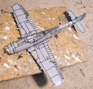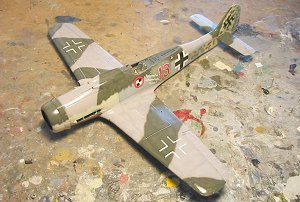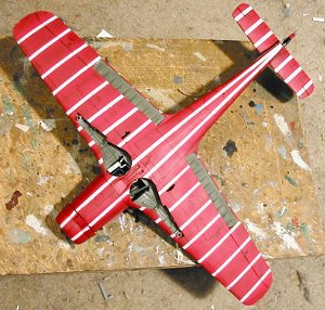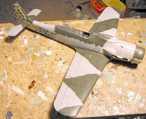 Once all this was done, I masked off the lower surfaces and went to work on the upper surface camouflage. By not making tightly-defined masks, I insured that the red border would be "ragged" when finished.