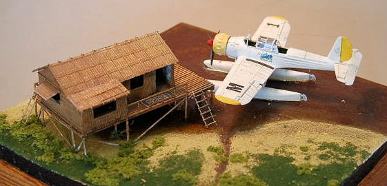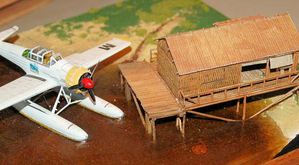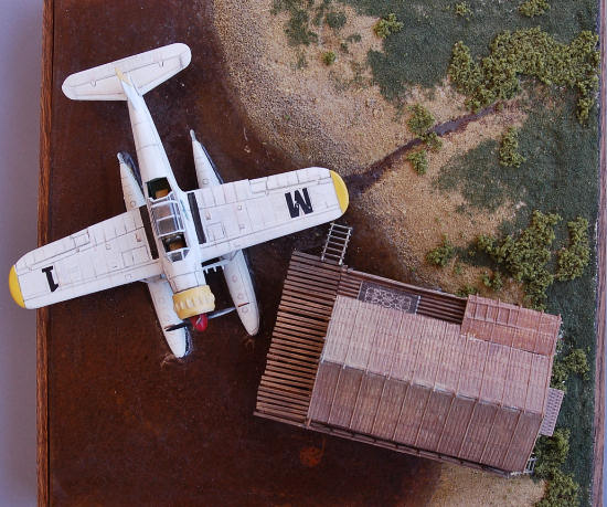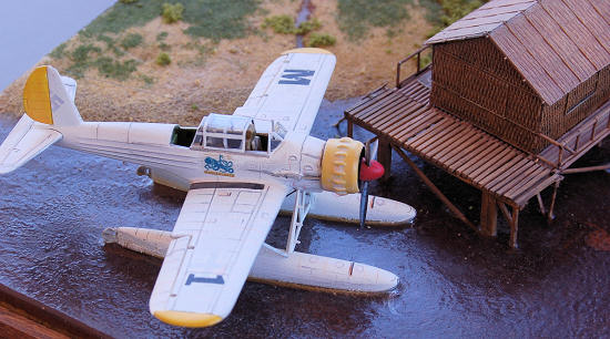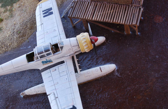 The water was a disaster that turned out well: I used a hot setting resin like a fool, one pour tinted green and brown about 1/4th thick over the base and my stingray and left to set up for a day. The plane was put into position, and the second pour was laid on…but I mixed the stuff too hot, and began to panic as I watched the paint begin to melt off of the floats. Time for a stiff drink and thinking about having to rebuild the entire d’ thing…but after two hours, holy cow ! It came out wonderfully ! Just the breeze from outside (you do not pour this stuff inside) made for some cool water ripples, and the plane did not sink into oblivion, I guess it is just one of those mistakes that work out.