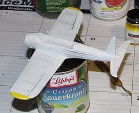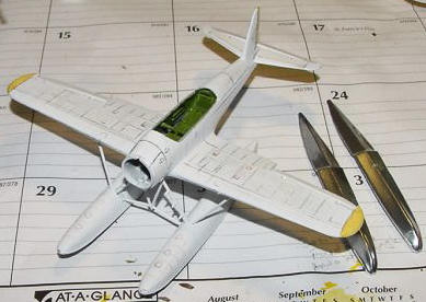 One of the best features is the brilliant engineering of the floats, they are separated at the waterline! I painted the whole craft , then glued on the aluminium bottom half of the floats with CA, using laundry clasps to hold them tight. My wife will probably complain when she has metal finish on her undies.