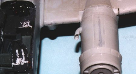 Controls and dials were added at appropriate stages and the whole internal assembly was painted with Gunze Sangyo RLM66, Grau. I used my references where the internal colours are shown as a mixture of RLM02 and RLM66, whether this is poetic licence or not is of no major concern as there is very little RLM02 used, but it does tend to break up a rather bland interior. Once the colour had dried it was dry brushed with Flat Aluminium to show areas of wear.
