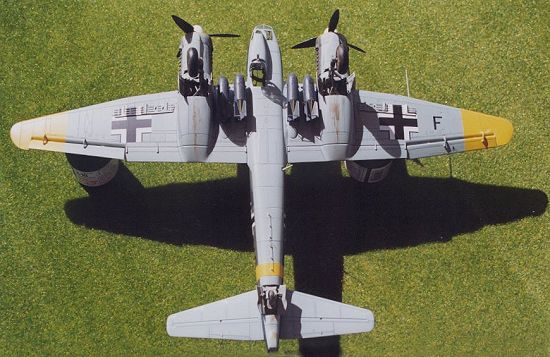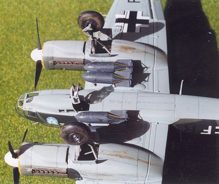 I sprayed the under surfaces RLM 65 using Aeromaster Warbird enamel colours and hand-painted the clear gondola and forward glazing, prior to attaching them to the fuselage undersides. The bomb sight was installed in the front part of the gondola and the join was done using PVA glue, which was then painted RLM 65.The twin MG81Z machine guns were painted and installed on their mount and installed in the rear of the gondola.