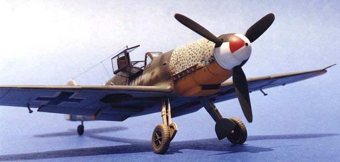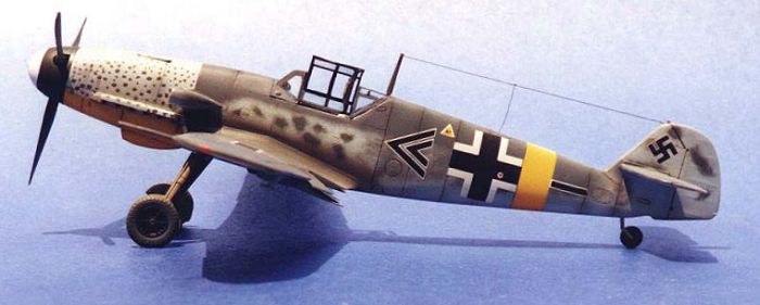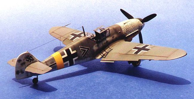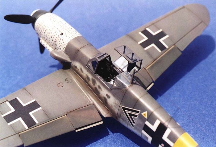 Having just come off two enormous projects that took a long time to do, I was determined to just build this model out of the box and relax. So I chose the most interesting kit decal selection, an aircraft flown by Hptm. Johannes Steinhoff in the Eastern Front in September 1942. This called for a standard 74/75/76 scheme with 04 accents. I first painted the areas to be yellow with flat white to establish an even application of the yellow color. Then Polly Scale 04 Yellow as sprayed. I masked the fuselage band, wingtips, and forward under-fuselage area with hardware store masking tape that had been cut with a sharp x-acto knife on a piece of plate glass. This insured sharp demarcation lines. The next color sprayed was Polly Scale 76 Light Gray. Then I sprayed the upper surfaces with Polly Scale 75 Gray Violet. I was surprised at how dark this shade was, compared to other manufacturer’s interpretations of the color. I figured that this would do the famous Floquil "chameleon" imitation and turn lighter as time went on, so I pressed ahead. Unfortunately, my assumption was wrong and the color never did lighten up.