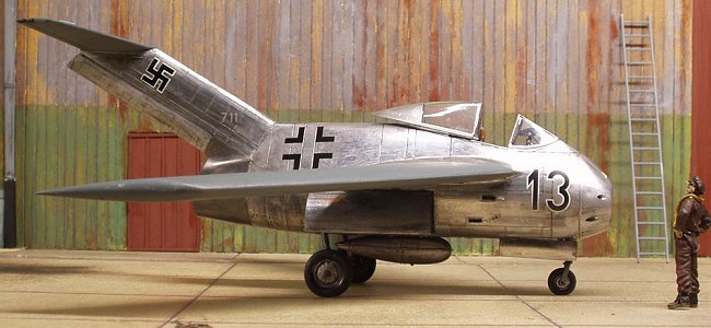 The Tamiya kit comes with decals for one (more or less fictional) operational aircraft in camouflage. Since it never reached this state, I preferred after marked decals. The decals I used came from EagleCals, No 29. This sheet is designed to be used on a Messerschmitt Me 262, and includes decals for an unpainted, just out of the factory aircraft with werkenummer 111711. I decided to use these markings. On the EagleCals sheet were quite a few general markings (nicht anfassen, hier afbocken) and the national markings as used on unfinished aircraft. Since the original 111711 was lost with a defecting pilot, I decided even the werkenummer might have been used again. The only decals from Tamiya I used were a big 13 on the left and right side fuselage.