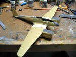 The nacelles are very easy to build, and since they are the same on each side, there’s no danger of mixing anything up. As I gave the parts a nasty angle, I didn’t bothered with gluing the prop shaft retainer, but the wheel well bulkhead fits very well. I also test fitted the three wing parts, only to find that they didn’t had the same angle. Out came the pan and I boiled some water to straighten them up. In about 5 minutes, everything was straight.