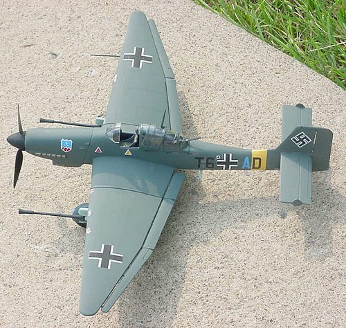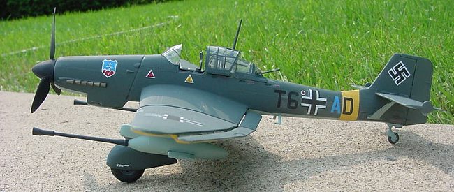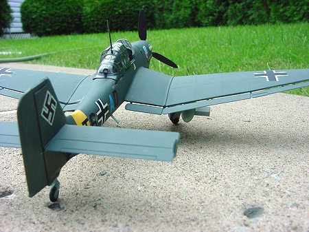 After the usual cockpit/canopy masking, I sprayed the belly Model Master RLM 65, then followed by more masking and the top was coated with RLM 70. After yet another masking session, the theatre band and the undersides of the wingtips were sprayed Model Master RLM 04. I also sprayed the propeller Flat Black (I know it’s not the right colour, but I prefer black propellers!). Before proceeding to decaling, I glued the gondolas on the mounts and brushed the gun barrels Model Master Gun Metal. (Editor's note: I'm suspicious of the overall RLM 70 color callout as the standard camo for bombers such as the Ju-87 was RLM/70/71 for the upper colors. I'd be delighted to hear from those of you who have proof otherwise.)