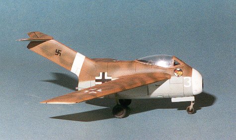 I had decided early on to paint the Ta-183 in North African Desert camouflage. I also wanted the aircraft to display a camouflage scheme much like that used by the Italians on their Macchi 202s early in the war. I had already painted a Hasegawa 1/48 scale Macchi in the scheme I was considering, one sometimes known as a "smoke ring". The problem was matching German RLM colors to those used by the Italians. Riding to the rescue was The Official Monogram Painting Guide to German Aircraft 1935-1945. On page 111 of this valuable reference source, one finds a comparison between Italian Sky Gray, Italian Sand Yellow, Italian Mottle Green and their German RLM counterparts, 78/79/80, respectively. Armed with this information, I first painted the nose, wingtips, and a swatch of the vertical tail Flat White. When dry these areas were masked with masking tape. Next, Aeromaster RLM 78 was sprayed on the bottom and up the sides of the aircraft. I wanted the topside camouflage pattern to wrap around the leading edges of the wings and tailplane, so the blue was masked off level with the wings on the fuselage and the leading edges of the undersides of the wings and tailplanes were left exposed. Next Aeromaster RLM 79 was sprayed on all exposed surfaces. While this dried the one-piece canopy was dipped in Future floor wax and allowed to dry. This causes the canopy to become crystal clear and protects it from fogging if you choose to use super glue to attach your canopy (not recommended). Next the canopy was masked with Scotch tape, then airbrushed with the interior color, RLM 66. The canopy was next sprayed RLM 79. After everything was dry, the RLM 80 was applied in a smoke ring style camouflage pattern. Remember to carry the camouflage to the bottom leading edges! Next everything was unmasked except the white parts. Yep, needed touching up. Thus began the tedious, but necessary process, of going back and forth with the three colors until everything looked right. Next the white areas were unmasked and any further touch-up done. The gear doors were pried loose, cleaned up, and their paint touched up as needed.