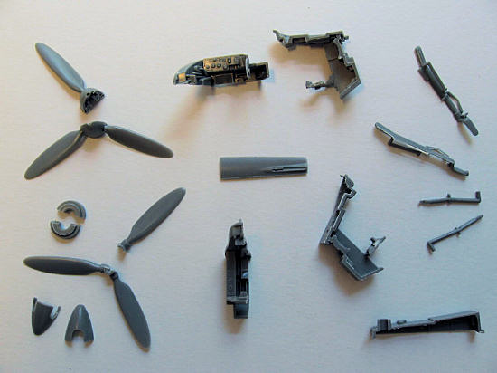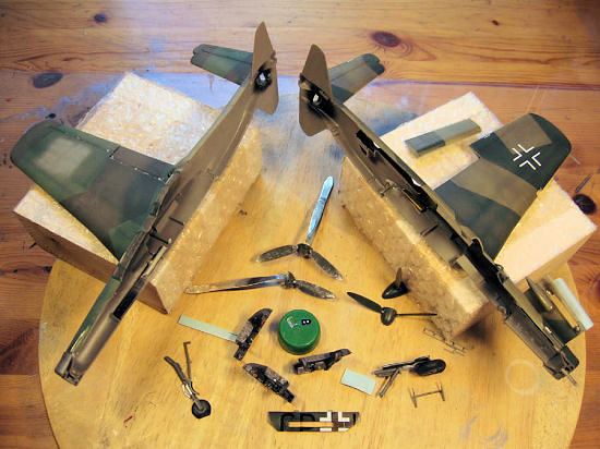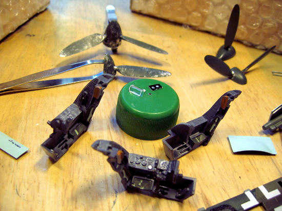 One thing that I hit upon was the fact that for parts that form a sub-assembly, you have a choice of first assembling and then cutting, or vice versa. There is an example in the picture below: one of the spinner/prop assemblies has been glued, then cut; and the other vice versa. In this case, the results were inconclusive: both methods produced results that were OK, if not stellar – this is a choice that probably has to be made after looking carefully at each individual assembly.