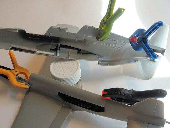 The major advantage is the fact that you can tackle the operation from two sides – inside and out. In the next photos you can see how I was able to use clamps to properly line up the backs and get the cockpit of the left fuselage to fit properly. Stretched sprue softened with lots of glue has been squished through the seams between the back and the remainder of the fuselage from the inside, as later on putty would be on the smaller seams. Spacers have been glued into the wings to make the profile match that on the fuselage (just how can something so quick have such a wing profile?). All of this would have been impossible or considerably more difficult in a conventional build.