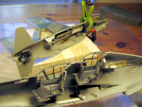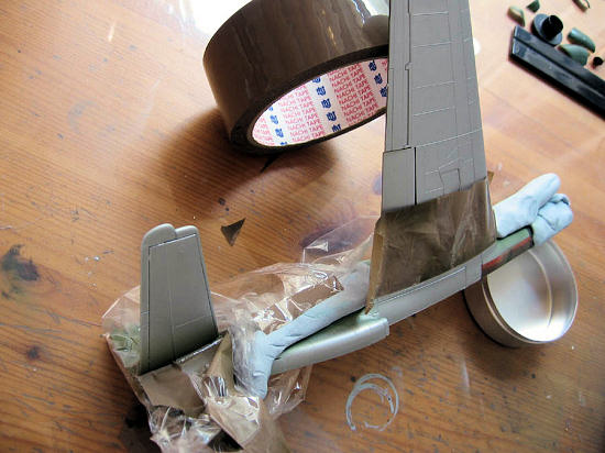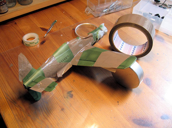 The next photo was taken less than an hour later. RLM 82 has been added to complete the upper side camouflage, and the areas to be sprayed RLM 76 have been masked using Blu Tack sausages as I wanted a soft demarcation line.