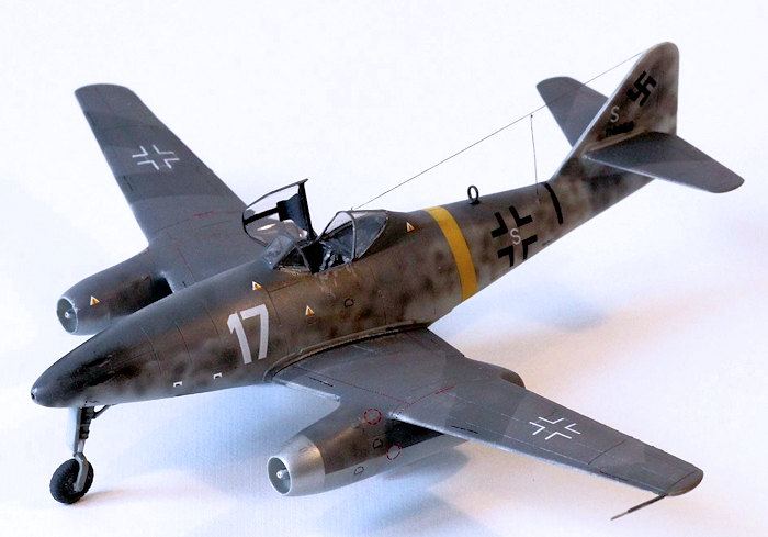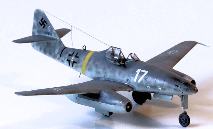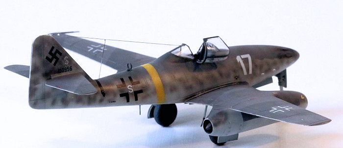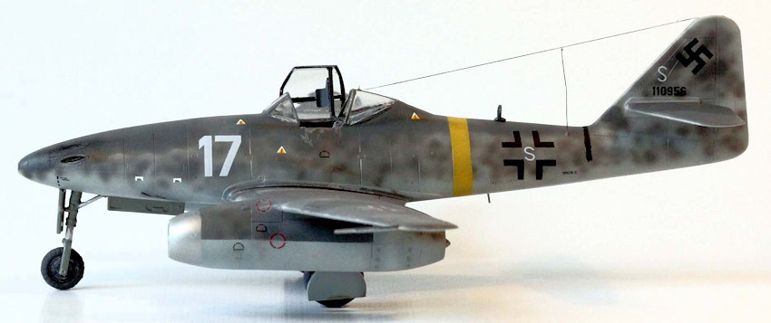 This particular 262 holds some importance because it can be ascertained to have been finished in RLM74/75/76, an early scheme once thought not applied to operative machines (see “Modelling the Messerschmitt 262” Osprey Publications, where the builder of this very machine regards it as most probably painted in RLM81/82 –though finishes it in the earlier scheme!) There are a couple of colour pictures that proves that conclusively. It is also unique in that it sports a Black open Balkenkreuz in the fuselage, instead of a White one.