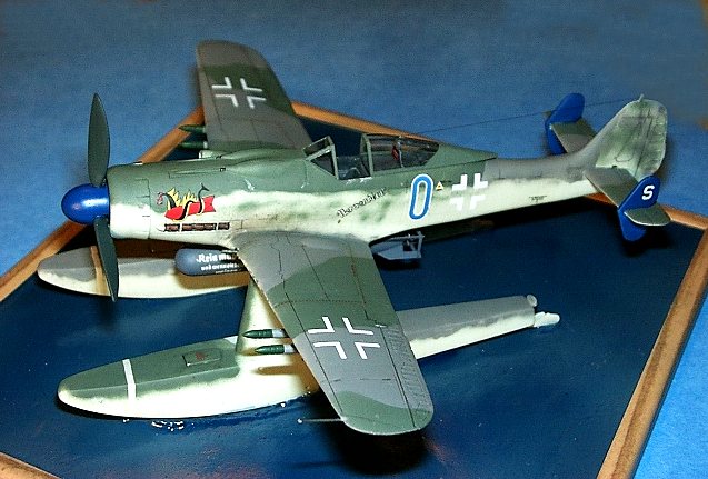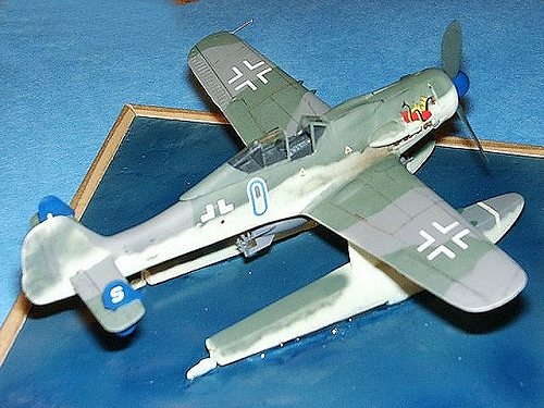 The undersides and floats where airbrushed with a coat of RAF sky, the upper surfaces with RAF dark slate gray and US dark gull gray. Even if these colors are not German, the plane keeps a German appearance (probably since Sky is close to 'RLM 84' and dark gull gray is close to RLM 75). After detail painting (exhaust stacks, gun barrels etc.) the model was given a top coat of clear gloss paint and decals were applied. The decals came from different sources - mostly from the Academy and Marivox sheets. After a light wash with diluted black paint, the model was sprayed with a top coat of Revell flat.