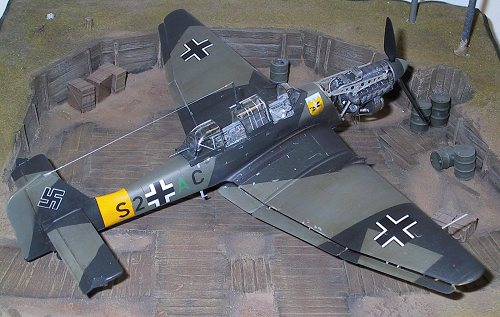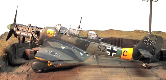 I chose to do the aircraft flown by Gruppen Kommandeur Helmut Bode. Sevastapol Crimea Russia, June 1942. Helmet commanded 3/St.G 77 throughout the Battle of Britain and on into Barbarossa, the invasion of Russia. RLM 04 Gelg theatre ID bands on the wing tips and fuselage.