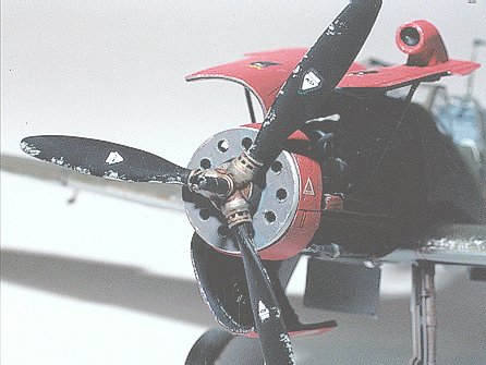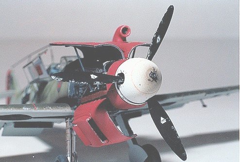 After allowing 24 hours for everything to dry down the entire model was coated with Testors gloss coat and allowed to dry again. The kit decals are pretty good but I had to add several stencils from Third group sheet #48-005. The squadron badge and prop emblems came from this sheet. This is the only manufacture I have found that includes the prop markings. Two different markings were occasionally used, an inverted triangle or a logo that looked very similar to the Hamilton Standard logo found on American aircraft. The kill markings for the rubber were printed in the same red as the paint job so I had to cut down a different decal from the kit sheet that was done in black. Great care must be exercised with the Hasegawa decals when using setting solution. I just about freaked when I applied Micro Sol and the decal edges started to curl up. This seemed to happen on the larger decals only.