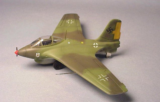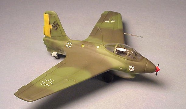 The overall paint scheme was equally simple, RLM 02 Grey overall, well no one said it was going to look stunning! Since I'm making this into an operative aircraft, late war colors using Xtra-color RLM 83, 82 and 76 were used, decals being painted through masks provided by Eduard and some of the Academy Me-163B kit decals. Heavy on the Future, please. Seal those decals and give the overall surface a smooth appearance before the final coat of Flat clear. The extra bits such as the pitot tube, antenna and nose mounted electrical generator were applied lastly and Viola!