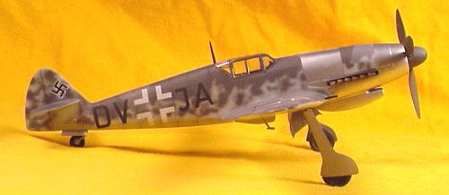 The two piece fuselage is a re-worked Arii/Otaki Me-109G, reworked in such a way as to add the extra scale inches to the nose and the prominent bulge for the turbo-supercharger. The only original parts in the kit are wings, the underside air intake, and the main landing gear; the rest are resin copies of the venerable Arii kit. By the way, that air intake is a bit suspect in shape, looks a lot like a Spitfire tropical air filter. Back to the assembly. The fit of the two fuselage parts was good once each part was lightly sanded on a flat surface with 180-grit sandpaper. And for the most part, the wings were attached easily and painlessly, care being taken to apply dihedral.