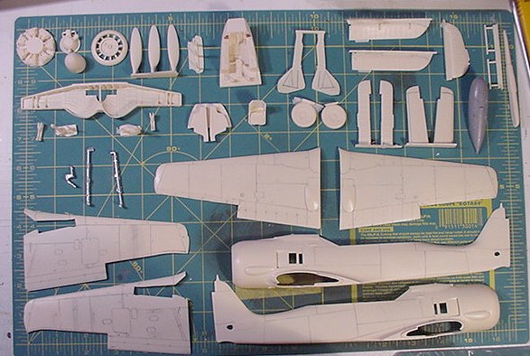 As this was my first attempt at a resin kit, I started by thoroughly studying the instructions and surveying all the parts to make some basic decisions and plan the order of assembly. Light resin flash was removed, all resin parts washed using a soft cloth and a warm solution of dish soap. After they were dry, all the parts were grouped into small containers by subassembly. I could see from the outset that the single most important factor in the construction of the model would be the correct orientation of the one-piece wheel well within the fuselage halves. Some careful sanding and test-fitting on both the outer surfaces of the wheel well and corresponding areas of the fuselage wing fillets gave me what I was after. Just to be sure, I test-fitted the 7 critical pieces comprising the wheel wells, fuselage halves, and wings during this process.