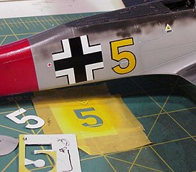 I couldn’t find a black trimmed Yellow 5 of the correct size or style on any available 1/32nd decal sheet, so I used plain yellow spares as an airbrush template, then trimmed the numbers with a black ink using a disposable Pigma drafting pen. Insignia and the JG1 badge were from Eagle Strike, while all of the stencils and WrNr were sourced from Mike Grant’s excellent decal sheet.