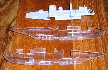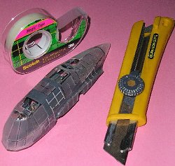 The kit is molded in a light gray hard plastic. An unusual feature of this kit is the gondola, which is molded entirely in clear plastic. The advantage of this is that there will not be any tricky placements of windows to worry about. Unfortunately, the joint line runs across two window panels. Unless these window panels are replaced, it would be impossible to eliminate this visible joint line.