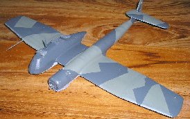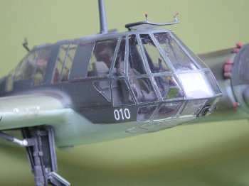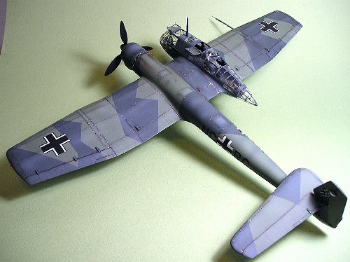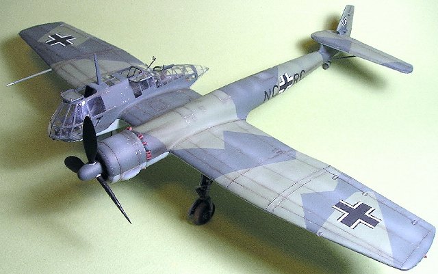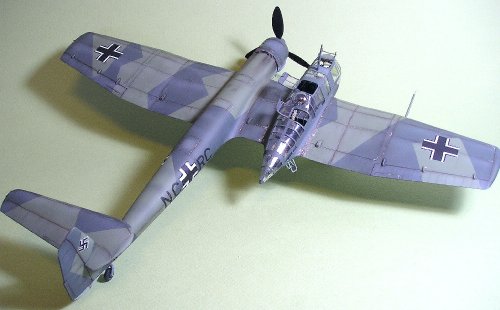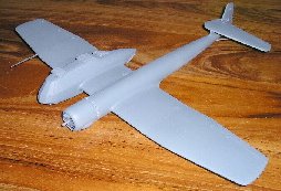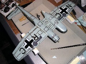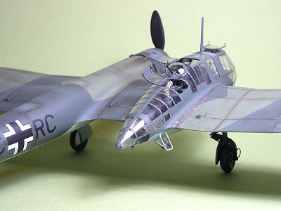The undercarriage oleos had lots of thick flash and the cross section was out-of-round. These are best scratch-built with brass tubing (like I did). The two MG-15 flexible machine guns were represented by shapeless blobs of plastic with lots of flash, rendering them totally unusable. These are best replaced with after-market accessories. Panel lines are recessed and quite crisply molded. Like most short-run kits, no locating pins or tabs are provided. Also the wing root joints to the engine boom and gondola are butt-jointed and it is recommended that strengthening spars fashioned from 40 thou plastic sheet be incorporated for reinforcement. This is a rather large and heavy model and the wing root joints will definitely crack if handled without any form of reinforcement in the wings.