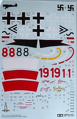 The decal sheet is standard Tamiya: thick, but all the decals are in register and the right colors. markings are provided for four “Sturmbocks” one flown by Hauptmann Wilhelm Moritz of IV/JG3, and three from JG300, including Leutnant Klaus Breitschneider, Unteroffizier Matthias Erhardt, and Unteroffizier Ernst Schroeder, all of 5./JG300. Complete stenciling is included for one aircraft, as the Reich Defense bands for each unit.