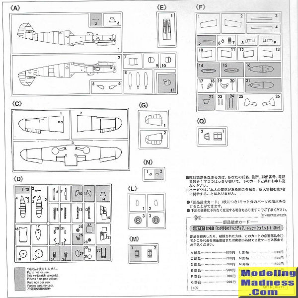 The model contains 94 pieces, 88 in light grey and 6 clear pieces (canopies etc...). Of the grey pieces, they´re all nicely molded, without a hint of flash (which means Hasegawa´s molds haven´t tired, or they´ve been replaced.