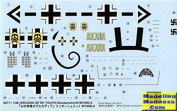 1) Luftwaffe, Bf 109G-6 Chevrons and Bars, flown by Phantom F. Harlock II (early markings), painted in RLM 04/70/76/79/80. It comes with a yellow rudder and a yellow nose cone with a black spiral.