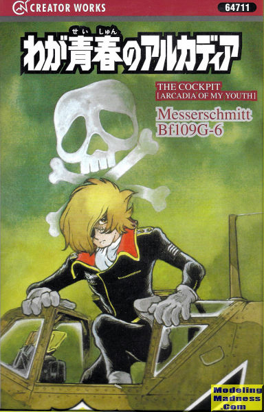 The kit comes in a top opening box illustrated by Leiji Matsumoto, in which you can see Captain Harlock climbing out of (or into) his Bf 109G-6.