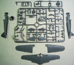two sprues of parts molded in gray plastic, a clear sprue, and a sheet of