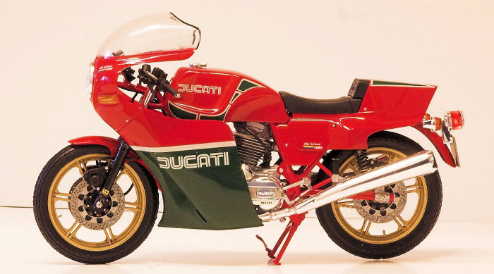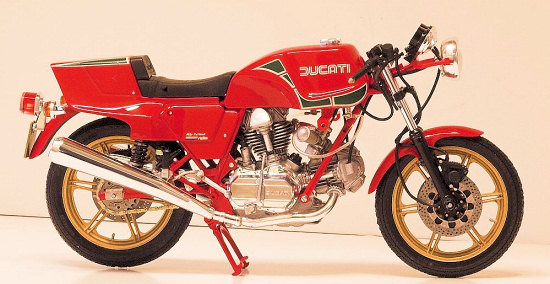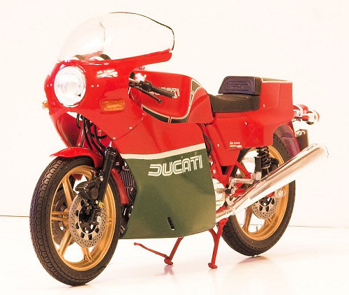 Mike rode a Ducati bike during this race and to commemorate the event this famous Italian motorcycle firm released a super sport "Mike Hailwood Replica" in 1980. Based upon the popular 900SS Ducati, but with full cowl and painted in the red and green of the Italian team, and with the single riders seat. Engine is a 90-degree V twin of 863.9cc which produces 63hp and can propel this bike to a maximum speed of 222km/h. This engine is said to be symbolic of Ducati, and in particular its valve system. On the normal 4 cycle engine, valve opening is done with a cam and closing by return spring. At high RPM's this system can contribute to "valve float". Ducati's system, called "Desmo-dromic", was designed by their engineer F. Taglioni in 1954, and uses cams to both open and close the valves, which allows for a much higher RPM. The engine is mounted in the diamond frame in an "L" format which is characteristic of Ducati. This compact engine arrangement accounts for the nimble handling and makes the bike competitive with the larger bore Japanese bikes. Standard suspension of double front forks and rear swing arm, plus triple disc brakes rounds out this bike, making it a superlative performer. However…The Mike Hailwood replica is about as far removed from the real race bike as you could possibly get and still call it a Replica. I should know having restored several replicas and an original race bike. Think of it as a Std 1980 Ducati 900SS with different bodywork and you will not be far off the mark.