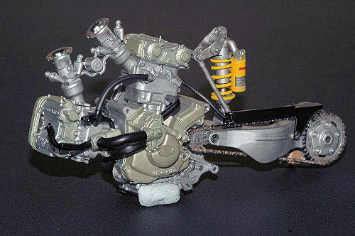 The next step is to bolt the swing arm to the back of the engine and encase the whole lot in the frame that is split down the middle to allow this. Once this is done you can add the exhaust system and the rear wheel.