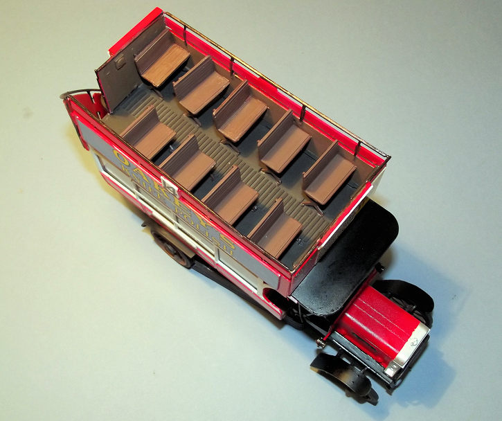 The previously assembled upper deck seats were painted in XF-10 Red Brown and their support legs Black, then they were added to the upper deck.