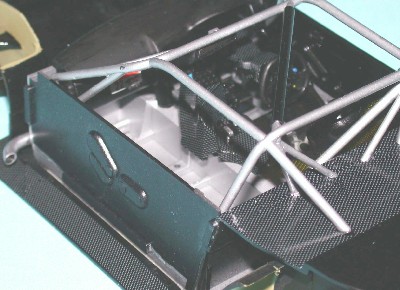 The two exhaust outlets were attached to the front of the tub, after being painted X-11 Chrome Silver. The interior mirror and the registration plate were added and the inside door trim added to the cabin tub, which was then put to one side.