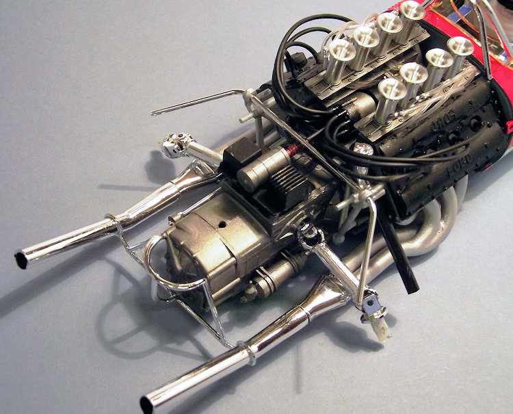 The black plug leads were temporarily tied off with cotton thread in a bundle and draped over the rear of the engine, while the transparent fuel lines were temporarily tied into pairs. The induction system sits on two groups of four inlet tubes just inside the cylinder banks. Four plastic inlet pipes/injectors each side have turned metal intake trumpets superglued around them. Significant omissions from the kit are the prominent mushroom-domed inlet grilles over the inlets of the eight intake trumpets. They are quite obvious on photos of the real thing.