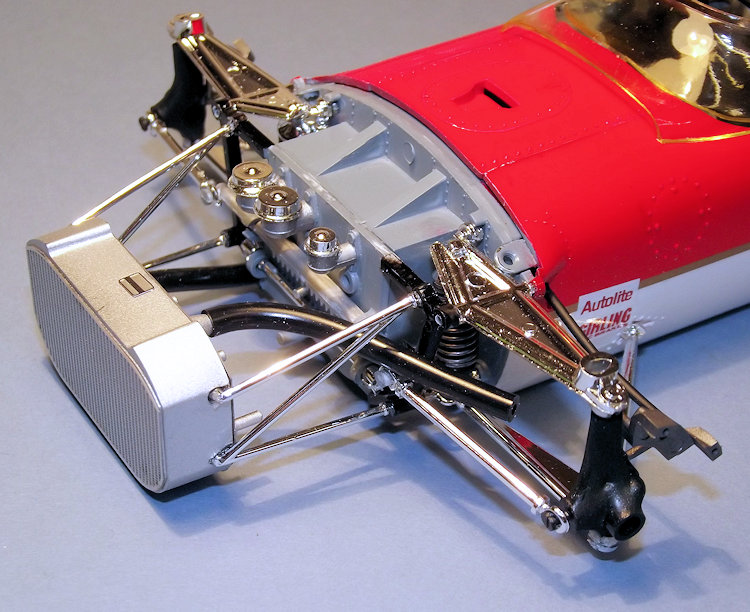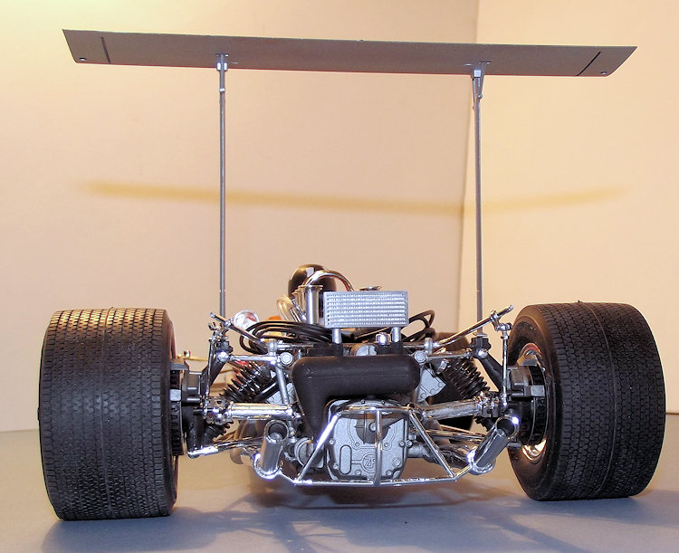 The wheels were secured by small plastic pins fed in from the inner face of the suspension uprights and glued into the stub axles on the wheel hubs. The long coolant pipe to the left side of the cockpit was painted Flat Aluminium, then linked to the rubber hose from the front radiator and the rear hose from the engine block. The nose cone was pushed into place and secured with two brass bolts onto the edge of the front bulkhead. Finally the rear wing was assembled by gluing the two support struts in place, painted Flat Aluminium and the kit decal for the striped upper surface installed. At stage 33, just two dabs of cement secured the rear wing to sockets in the rear suspension and the 49 was ready to take its place on the grid. On completion I found that the suspension works – just. If gently compressed it creaks and groans its way up and down, but there is no way this race car is ever going to be pushed across the carpet.
