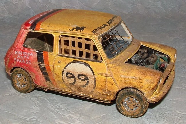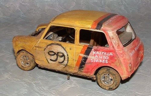 The final weathering was the addition of the mud, and lots of it, after a race it was not uncommon to have a 3 inch layer of mud and crap on the bonnet and hanging off the roll cage and your helmet. The mud was recreated using DAP wood filler, Rimu if I remember correctly.