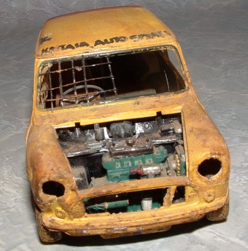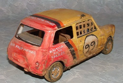 Once the painting was done I took the model outside and “played” with it on the concrete for a while, by crashing the Mini into the concrete steps I scratched and chipped the paint , just like the original.