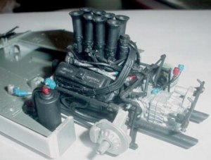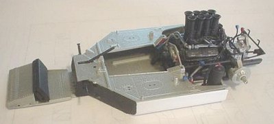 The engine was painted flat black with an aluminum transmission. As with and auto kit, the engine was painted as an assembly. The various hoses have red or blue fittings on each end. These were painted all at once before being removed from the trees. Three coats of acrylic paint was needed to cover the black hoses.