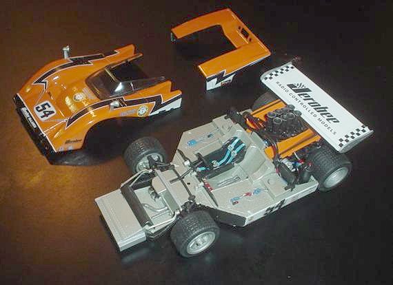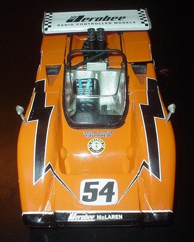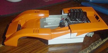 The instructions call for "McLaren Orange" for the body, but I couldn't find any. I ended up using a 94 Volkswagen Gulf color - "Tangerine". I think that it comes very close to McLaren Orange. To do the sides of the body, I photocopied the decal sheet and used the decals as masks to paint the white areas.