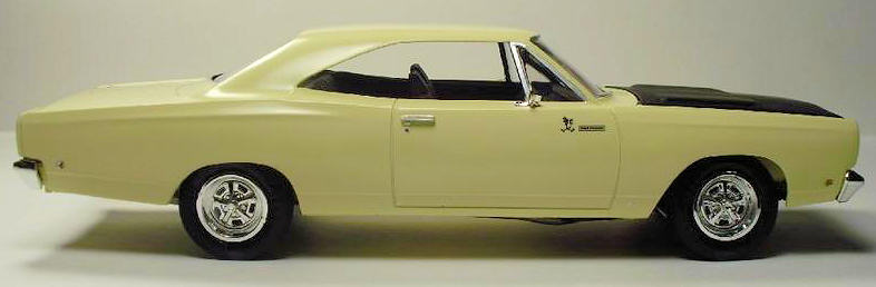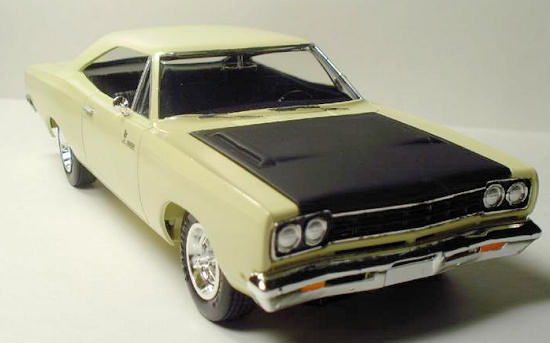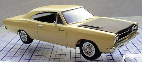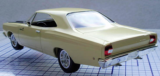 The home stretch, time to put the front grill and bumper on to the body, then glue the front and rear windshield and rear view mirror in, I leave the side windows out, rolled down, so you can see inside easier. That and I am just a tad lazy. Next you pry the body apart at the bottom and gently fit it over the chassis. With this done the rear bumper is added then the fiddly little bits, mirrors, tailpipe extenders. Lastly I paint the trim, marker lights, parking lights, taillights, door handles and door locks. Add the Roadrunner decals and you are done!