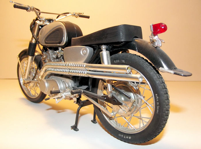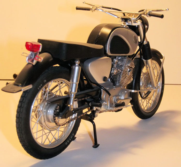 The key to the build was the bike’s frame, split lengthways by Revell and a tribute to the toolmaker’s art of the period since it formed the rear suspension pivot, curving up and under the fuel tank to meet the steering tube behind the forks. The rear section of the same moulding provided a frame tube rising rearwards to support the saddle frame and rear suspension dampers. The whole structure clipped down on top of the engine to form the core of the bike. The clutch housing was fitted , trapping the drive chain and rear sprocket, the rear suspension arm and chain guard. This was the sort of assembly where three hands might have been useful. The rear mudguard was fitted together with the two suspension damper units and with some trepidation the structure was sprung open to enable the back wheel to click into place.