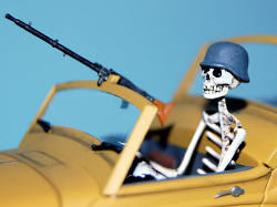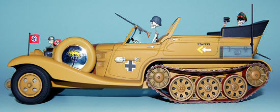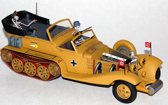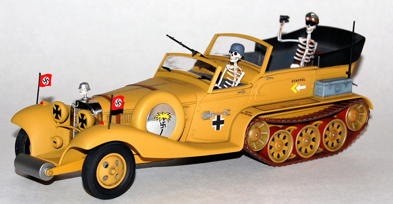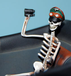 The driver and Rommel skeleton were painted flat white for the base then given a wash of black ink. I then added Burnt Siena oil paint over them and removed most of that with a cotton swab. I painted the eye and nose openings with flat black and the teeth were picked out with ivory. The “bones” were done. Rommel’s hat was painted to match the box art and the completed figures were set into place. I did not glue them in just placed them in their seats.