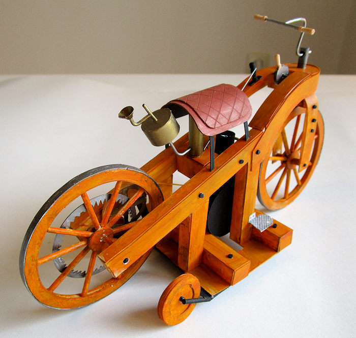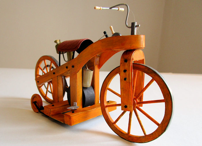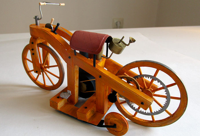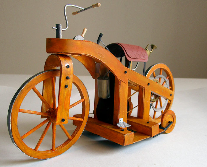The original Reitwagen was destroyed in a fire in 1903, but several replicas exist in collections at museums in Stuttgart, Munich, Ohio, Australia and Japan. The replicas vary considerably, depending on how they interpret the original plans and which model they follow. So anyone wanting to model this historic machine will have to make up his own mind about which version to follow. There are even short films on Youtube of enthusiasts riding the replicas. Presumably their trousers are made of asbestos.