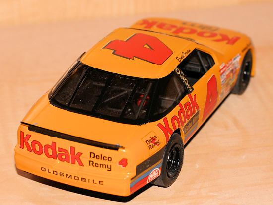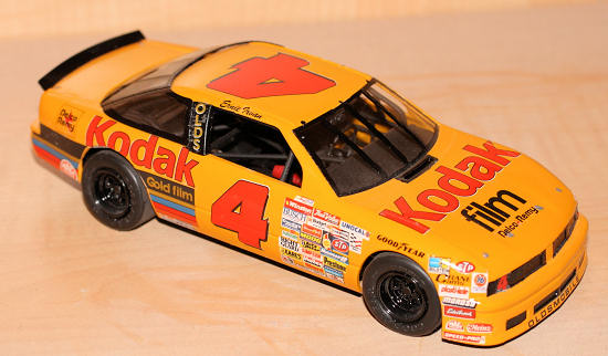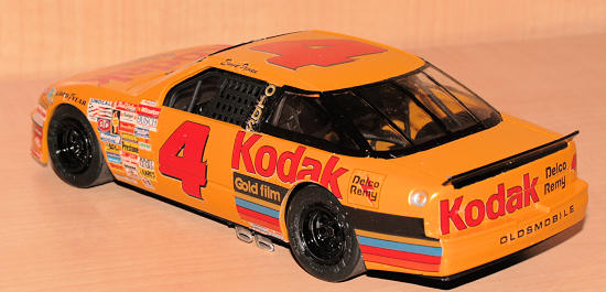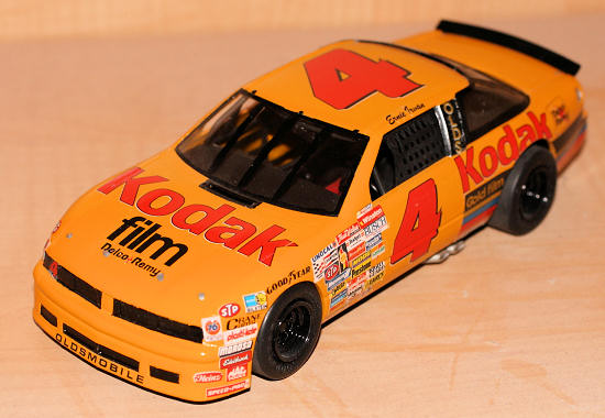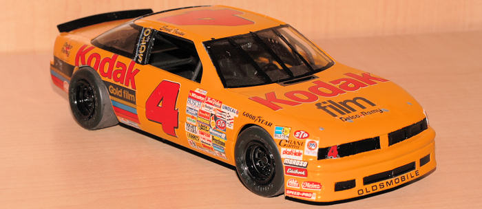 For the body, First I primed the car black and wet sanded the patch area again to get it real smooth. Then I masked off the grill openings on the nose, the B-posts and the carb inlet at the base of the windshield. Then it was time for color. The #4 team painted all of the Kodak cars the same shade of yellow, starting with the first Olds in 1986 all the way to the Pontiacs in 2003. It was a GM factory color called Wheatland yellow and it matched Kodak’s flim boxes. The easiest way to match the color is to give the body a flat red under coat and then spray the body Duplicolor Schoolbus Yellow. You can also use regular Testors yellow as well as it as an orange tint to it. After the body cured for a few days, I pulled the masking off and started polishing. I lightly wet sanded the body with 4000 and 6000 grit polishing cloths and then rubbed it down with polishing compound and a flannel cloth. I painted the rear spoiler gloss black and glued it to the body. I shot the body with a light coat of gloss clear and then started decaling. AMT’s decals aren’t as bad as Monogram’s decals from the 80’s but they are a tad thick and the glue on the decals is a murky white. You will be changing the decal water a few times. I usually start on one corner and worked my way around the car.