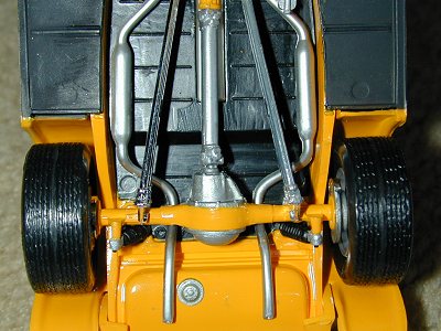 I then painted the bottom of the model’s interior flat black to provide a contrast when the kit was assembled. At this stage, the exhaust system was given a coat of aluminum paint and glued to the chassis. The engine was then mounted to the chassis and the drive shaft, painted MM steel, was connected between the transmission and the rear differential housing.