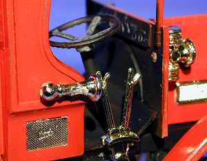 I tried to find pictures of old Mack trucks to help determine an appropriate overall paint scheme, but was relatively unsuccessful in that endeavor. After discussing this with my friend, we decided on a bright red paint job (hey…who knows what color they painted these things in 1907!). With that decision, I opted for my favorite gloss red paint: Model Masters Guards Red, which is a fairly close match to Ferrari Red. The first paint step was to give the cab interior a coat of Testors flat black. While I had the flat black out, I sprayed the frame assembly the same color. I then dry-brushed the dashboard instruments with flat white paint to highlight the gauges.