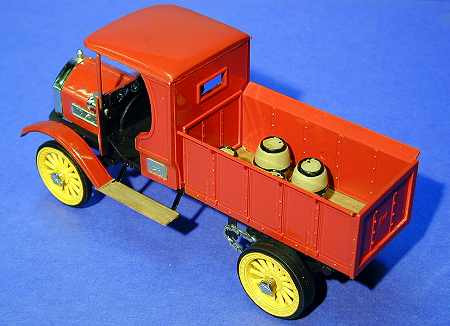 After painting all the parts, I began the final assembly process. I mated the truck box to the bed and frame, and then glued the cab roof to the cab assembly. I attached the cab assembly to the frame with superglue and glued the wheels and tires to the axles. The running boards were glued on, and then the front fenders were attached. Finally, I glued on the various chrome pieces – radiator, horn, lights, brake assembly, and hubcaps. To add to the model, I painted the metal rims of the assembled barrels and placed them in the bed.