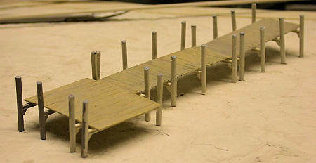 The pier was built from various Evergreen styrene stock, painted with acrylics and weathered in various ways, not the least using washes. First I made a sketch drawing of the layout, then a cardboard template, marked the poles and then started building. The poles were sunk into holes drilled into the fairly soft plaster.