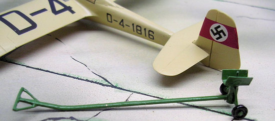 The last piece to add to the kit is the clear acetate cockpit canopy, two of which are provided one of which being extra. These also contain fine raised frame lines, which should facilitate painting of the glasshouse type of frame. Close examination of the side views will indicate that close to the leading edge area and beneath the wing there is a small rectangular raised panel that is omitted on the kit but which is very easily made out of a small plastic card 1/32 inches thick. There is one on each side and should be added, as these are present on all the Kranich photos I have seen. One suggestion I feel should say is that CMR should consider issuing a twin- wheel dolly that goes under the fuselage and which are detached once the glider is airborne. I have scratch built a dolly trailer that gives a different aspect to the model when displayed at dispersal.