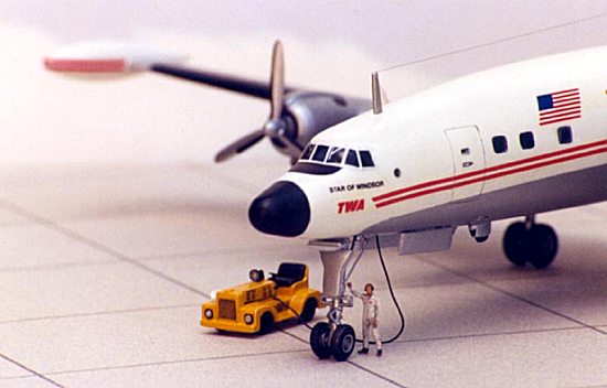 Ink washes were applied to the control recesses and engine areas. Windshield wipers were simulated with thin cut strips of silver auto stripping tape and stuck into position. The tractor was also primed in flat white at the same time as the plane. Once done, it was given three coats of Polly Scale Reefer Yellow (yep, you guessed it, a model RR paint). The wheels, engine, and seat were paint steam power black, with the tires later receiving a coat of Polly Scale Tire Black. The tractor was also given two coats of FUTURE and ink washes applied to the recesses and grill. The headlights were painted ModelMaster Chrome Silver and given a drop of Krystal Klear once the paint had set up. The battery charging wire was done with coating copper wire attached to predrilled holes in the tractor and the plane. Lastly I added two navigation lights to the tips tanks with small disks of Bare-metal foil (one painted clear red and the other clear green) and drops of Krystal Klear.