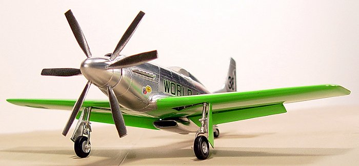 The kit comes in one of the strongest boxes out there. The metal parts are bagged to keep them from scratching the plastic. It is molded in a low pressure injected light blue plastic with no locator tabs and large injection ports common on low pressure short run molds. I was surprised that the landing gear is cast in metal and is very well done. The “World Jet” racer’s landing gear is not a stock pair of struts but are hand polished works of art in themselves. The canopy is a crystal clear vac-u-formed shell and is dead on perfect in shape. The decals are for the 1999 colors of World Jet, Inc but give you the choice of building the older stock tail version if you wish to do the major surgery of putting a stock P-51D tail on. (Rumors are out there the gang at High Planes are going to do “Precious Metal” colors for a future release.)